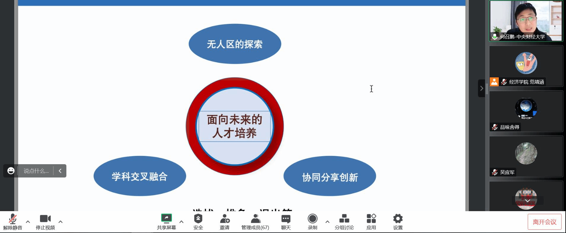针对中央财经大学经济学拔尖人才培养理念与举措,何召鹏教授指出:应建设时代化、本土化、国际化、理论化的人才培养模式。积极开展教材体系建设、实践调研、专业读书会等活动,探索导师组培养模式。