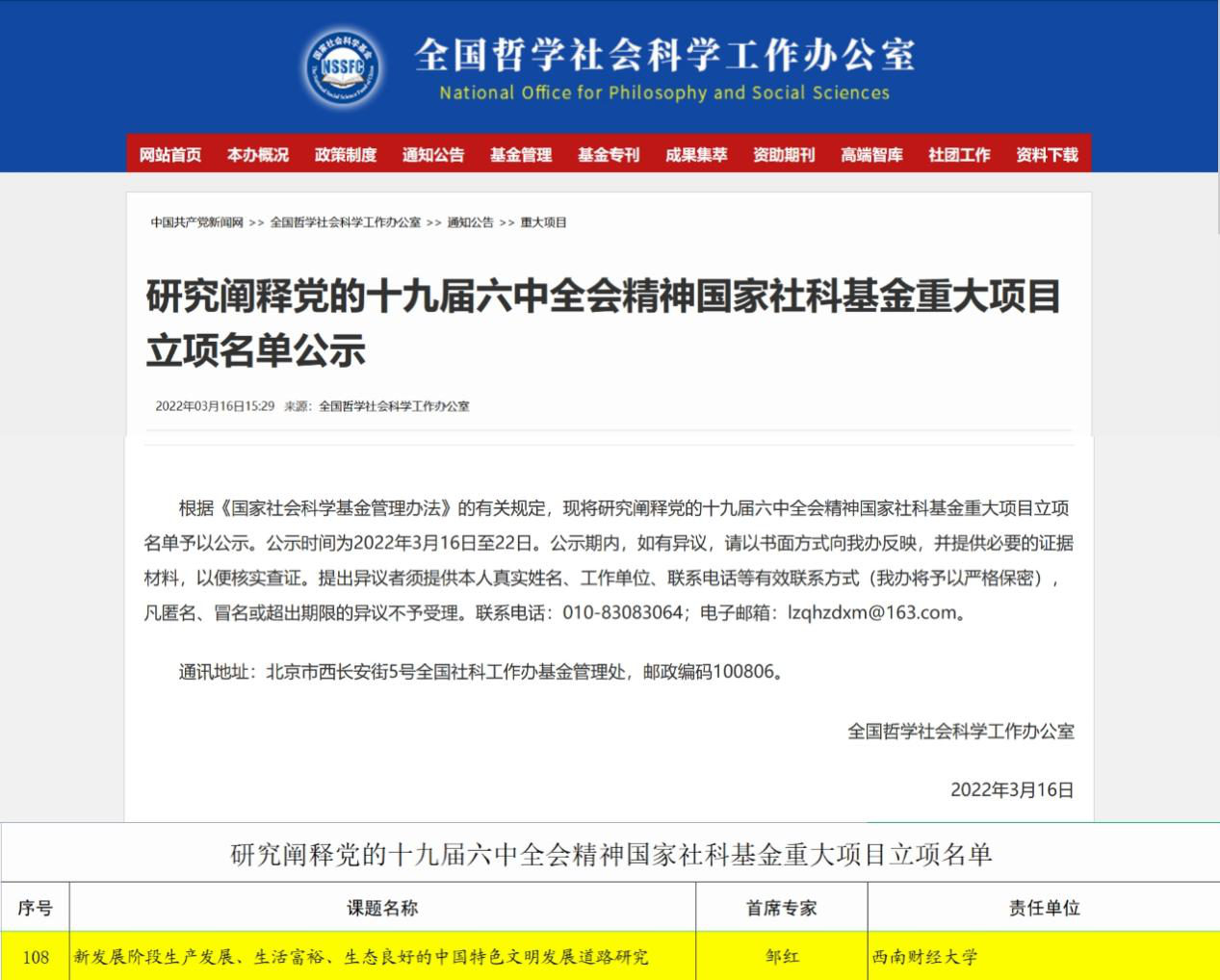 2022年4月8日,全国哲学社会科学工作办公室公布了研究阐释党的十九届六中全会精神国家社科基金重大项目立项名单,全国130个课题获立项,米乐官网邹红教授为首席专家的《新发展阶段生产发展、生活富裕、生态良好的中国特色文明发展道路研究》成功中标立项。此课题围绕“新发展阶段中国特色文明发展道路是什么,如何坚持并走好这条道路?”两大具体问题,以“生产生活生态(简称三生)”全面绿色转型和“三生”绿色统筹协同为抓手,探寻新发展阶段绿色低碳可持续的生产发展道路、绿色共享的生活富裕发展道路、人与自然和谐共生的生态良好发展道路、“三生”绿色协同发展道路的内在机制与实现路径,力求为人类文明新形态提供新发展阶段的中国方案。这是邹红教授继2018年主持申报研究阐释党的十九大精神国家社科基金重大专项项目《完善促进人民美好生活消费需要的体制机制创新研究》获批立项之后再次获得的国家社科基金重大项目立项。