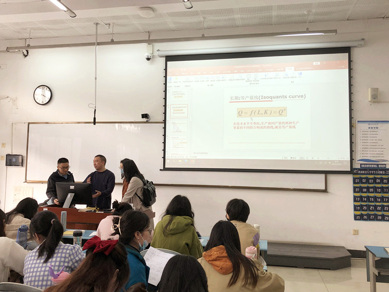 学院组织教师观摩袁正《中级微观经济学》和陈志舟《市场经济运行与宏观调控》两门课程,两位老师分别立足于专业、课程、课堂,结合教学资源建设和课堂教学实践进行了经验分享。袁正老师在“生产者行为”这一讲中,引入数字中国建设,数据成为了生产中重要的生产要素;讲到生产要素的分配,袁老师强调党的二十大报告指出,坚持按劳分配为主体、多种分配方式并存,坚持多劳多得,鼓励勤劳致富。陈志舟老师就“新时代国有企业的改革与发展”设计了九个板块,专题学习习近平总书记关于国企改革与发展的一系列重要讲话和指示,讲解十九大以来国有企业改革的顶层设计、统筹推进与取得的重大成就。