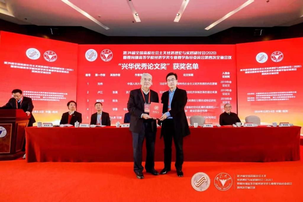 2020年12月5日上午,第 34 届全国高校社会主义经济理论与实践研讨会(2020)暨教育部高等学校经济学类专业教学指导委员会第四次全体会议在浙江大学隆重召开。本次研讨会中,中国人民大学刘伟《习近平新时代中国特色社会主义经济思想的内在逻辑》等5篇论文入选第五届"兴华优秀论文奖"。米乐官网副院长、中特中心副主任盖凯程教授论文《“国进民进”中国所有制结构演进的历时性特征》名列其中,荣获“兴华优秀论文奖”。全国高校社会主义经济理论与实践研讨会领导小组组长、南京大学洪银兴教授为其颁奖。