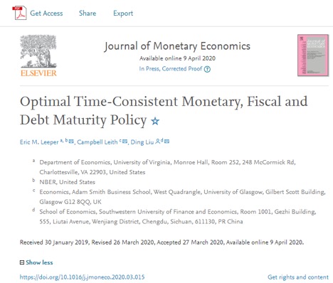 日前,米乐官网MILE米乐集团西方经济学研究所刘定副教授(通讯作者)与美国弗吉尼亚大学的Eric Leeper教授和英国格拉斯哥大学的Campbell Leith教授合作的论文《Optimal Time-Consistent Monetary, Fiscal and Debt Maturity Policy》在线发表在宏观经济学和货币金融学国际顶级期刊《Journal of Monetary Economics》上。