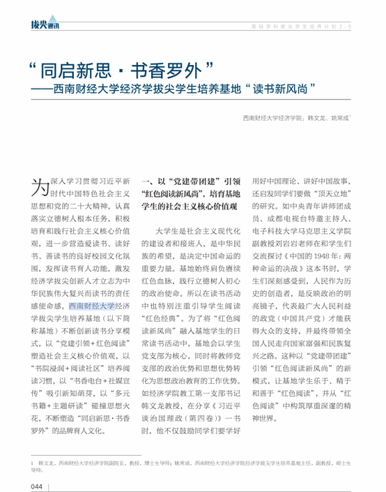 文章主要从以“党建带团建”引领“红色阅读新风尚”,培育基地学生的社会主义核心价值观;以创设刘诗白书院的“开放阅读社区”,夯实基地学生的马克思主义政治经济学底色;以“数字新媒体赋能阅读新模式”实现从“会阅读”到“慧悦读”跨越式进阶,厚植基地学生的知识底蕴;以“交叉融通+深耕细作”精进臻善,助力培养具备“新财经”特色的拔尖创新人才四个方面出发,介绍了经济学拔尖学生培养基地不断创新读书分享模式,在塑造“同启新思·书香罗外”品牌育人文化方面的优秀案例。