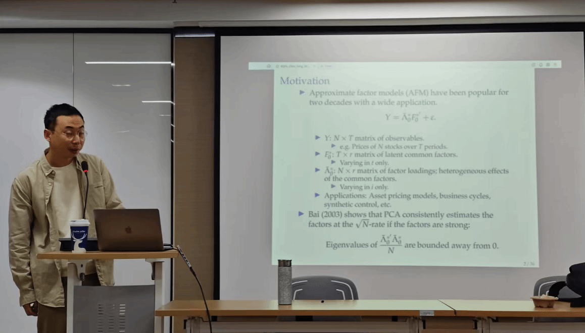 冯老师以股价预测为切入点,分析了经济学界对因子分析模型的研究,在阐述了前人模型假设的“薄弱点”之后,介绍了他们团队在因子分析角度建立“大一统”模型的研究成果。冯老师特别指出,因子分析模型的回归方法跟传统的线性分析是有区别的,例如,传统的回归分析要求必须有解释变量和被解释变量同时存在,但是因子分析模型只有被解释变量,没有传统意义上的解释变量。在这种情况下,只有把模型中的系数作为解释变量,通过递归法实现收敛得到因子。在阐述了均值模型(AFM)和分位数模型(QFM)之后,冯老师特别介绍了他们团队建立的“大一统”模型,并称之为universal factor model(UFM)。这个模型解除了前人的强因子假设,即现实中存在的弱因子仍然能够纳入模型而不会对模型产生较大的影响。
