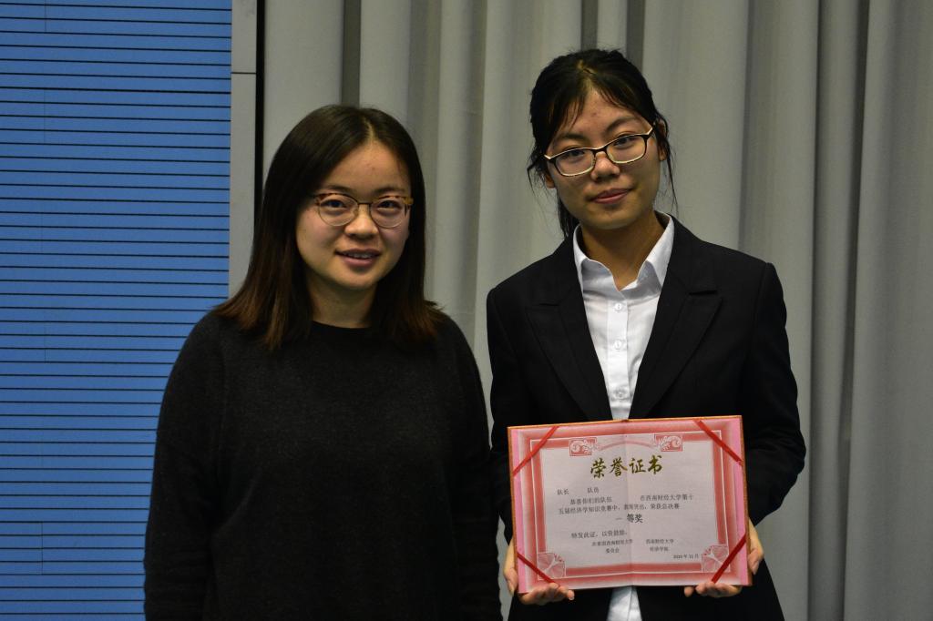 最后, 各队成绩依次颁布,悟能队更胜一筹,折得桂冠。袁正老师做总结发言,他对同学们能够在有限的时间内做出这样的成果十分欣慰,虽然各队有一定差距,但无论是第一名还是第六名,都值得鼓励。本次经济学知识竟赛为莘莘学子提供了学术交流的平台,比赛聚焦民生热点,在激烈的交锋中迸发出思想的火花,必将为同学们进一步探求经济学真谛打下坚实的理论基础。